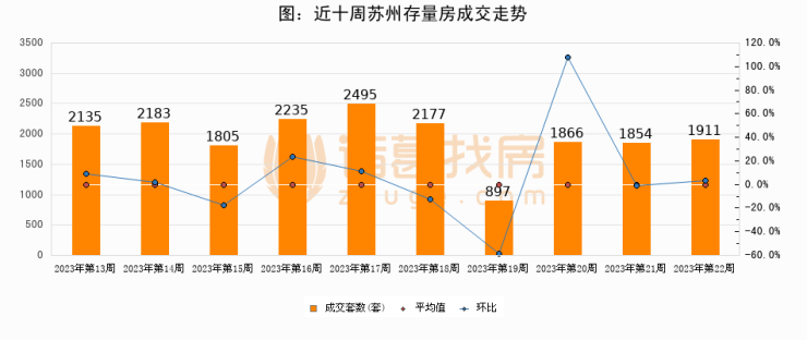 存量房方面,第22周苏州存量房成交1911套,较上周增加57套,环比上涨3.1%。从近十周成交走势来看,周均成交套数为1955套,本周低于平均水平2.3%。