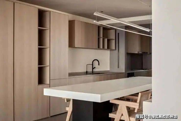 西厨设计上相对克制,将烟火气模糊淡化。餐厨空间呈不规则条形结构,整面柜体利于将所有视线内物品收纳于此,始终保持整洁清爽的氛围。木质和岩板元素之间的碰撞,呈现出一干净空间的氛围。家,围坐而食,珍馐百味,共享此刻。