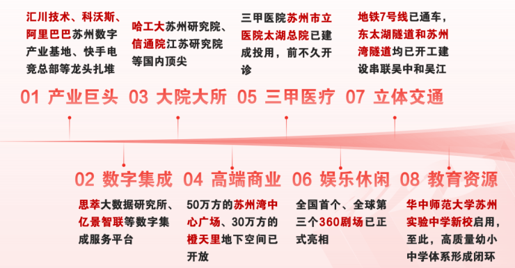 项目所在的吴中太湖新城,经过十余年的高起点规划与高强度投入,凭借得天独厚的太湖生态资源,以及齐备的王牌商业、顶尖名校、三甲医院和高端产业集群,成功蜕变为苏州人才集聚、价值凸显的正统“富人区”。