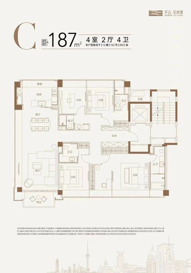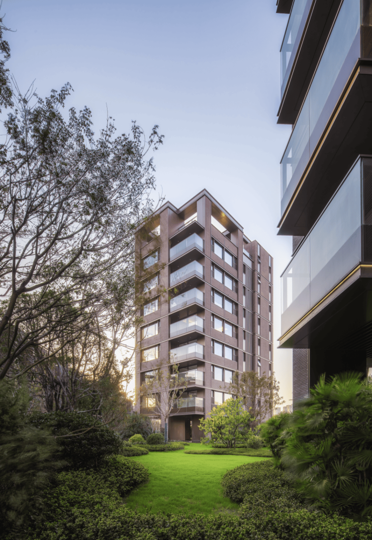 外立面方面,项目采用优雅的干挂陶砖幕墙,结合铝板的质感,演绎独树一帜的褐色美学符号。园林景观采用“一谷五情境”设计概念,致敬海派文化,将老上海的花园意境通过现代手法复刻,呈现洋房的慢生活。