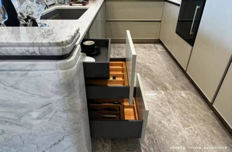 采用怡口直饮水、铂浪高水槽及龙头,水槽口内嵌厨余粉碎机,内里使用硬度堪比钻石的石英石材质。