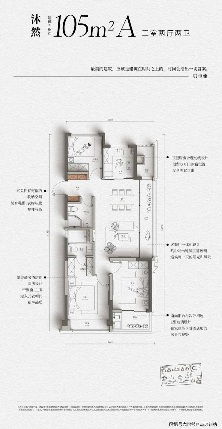 建面约105m²的户型有近6m的纯屏巨幅玻璃,大大提升了采光和观景的需求,“起床就能看到风景”。约5.95m大尺寸的横厅连接超长阳台,做出了奢阔的空间感,形成全家人欢聚的超级大公区。媲美高奢酒店的套房主卧带走入式衣帽间、主卫和飘窗,南次卧带阳台,还是L型玻璃护栏设计,尺度感非常阔绰。