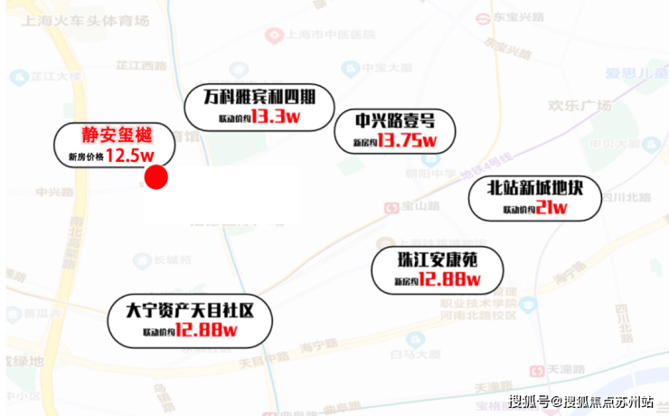 目前周边的新房价格来看,安康苑在2021年时均价已经来到了12.88万/㎡,万科雅宾利四期联动价约13.3万/㎡,此外中兴路一号攀升至13.75万/㎡,以及静安04-05、05-01北站新城地块21万/㎡惊人的房地联动价。