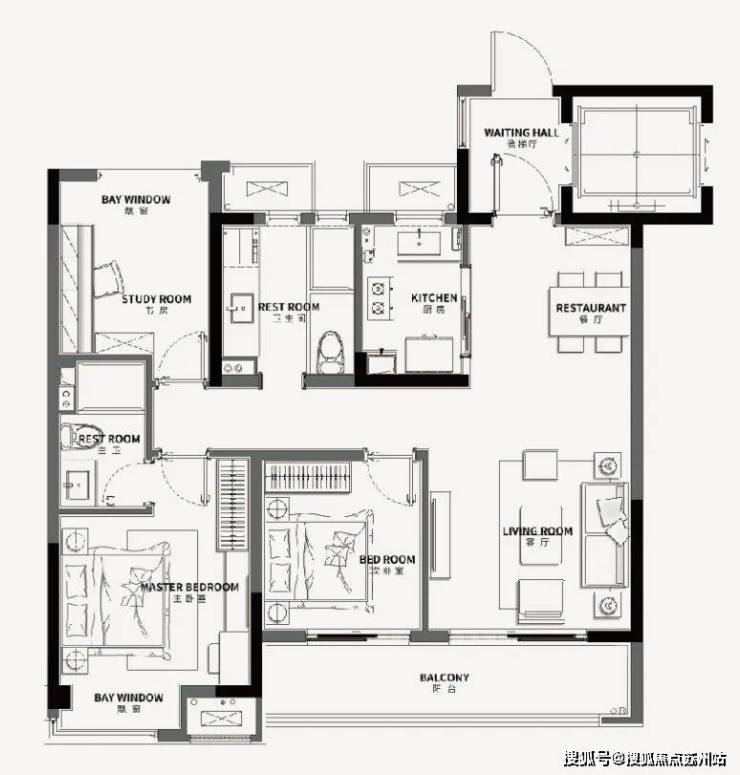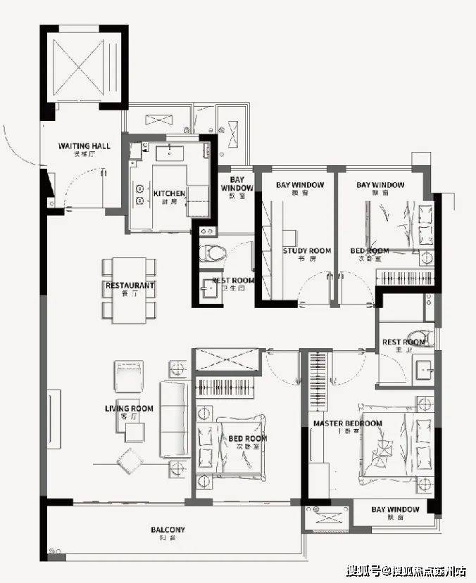 该户型主要分布在1#、3#的东边户,4#、6#的边户和5#西边户,和102平有些类似,只是北边多了一个书房的空间,但还是和102平同样的问题,空间比较紧凑。