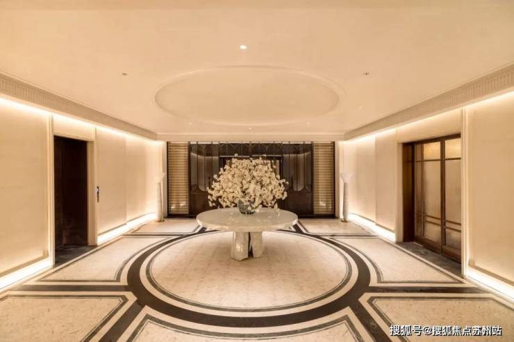 预接待厅地面瓷砖采用 威尼斯白 与 爵士白石材拼花 设计,纯人工铺装保证花纹的奢华质感。