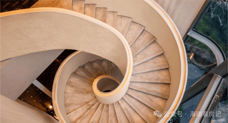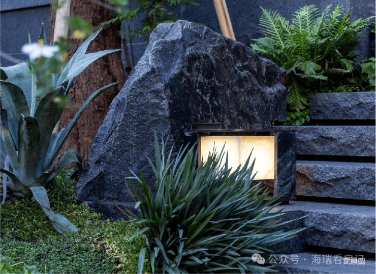而实景首开的近2000㎡下沉庭院,作为“园林灵魂”,漫步此间,你会看见:乌金原石围合的“玉扣绿岛”上,低调静放着团队自“天下玉源”河南南阳历时遴选而来,近7000年的“国玉”独山璞玉,与山野林木共此氤氲灵气,尽显东方温润;从诗经走出来的近11m高参天乌桕,则再现古诗中所描述的“秋林城郭画图中,乌桕千株照眼红“的诗意;采用约6.7m幻影蓝奢石打造的“叠级水瀑”跌水台,池底以呈现天然墨绿色泽的蓝金刚石铺就,映水之澄明,境之悠远;连台阶都采用了“黑色花岗岩之王”安哥拉黑整石,沿云梯而上,让人返璞内心东方......