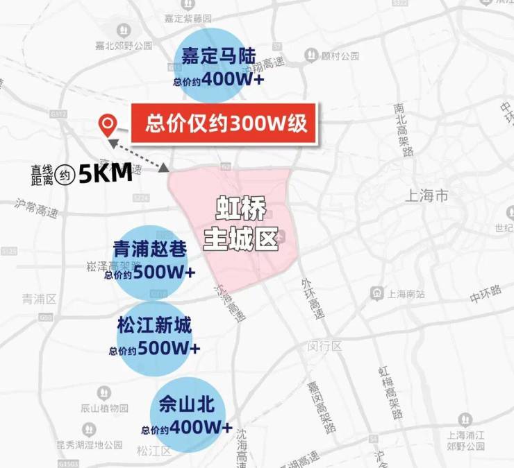 通过百度地图测距我们发现:安亭距离虹桥主城区直线距离仅约5公里,但总价仅约300万级!