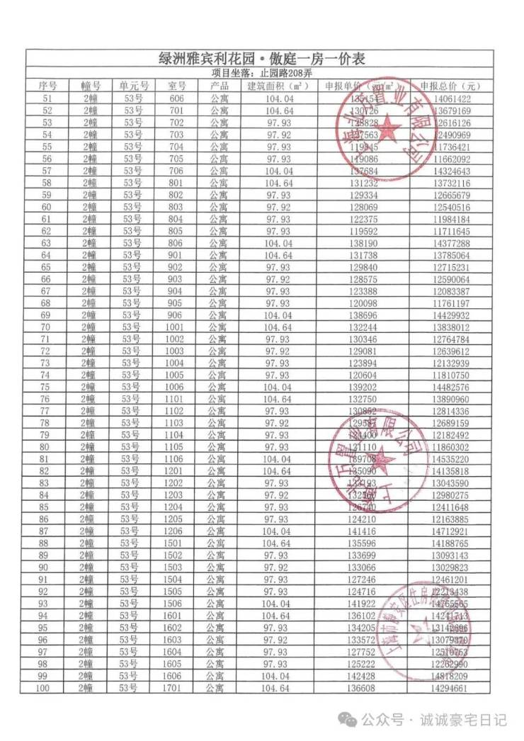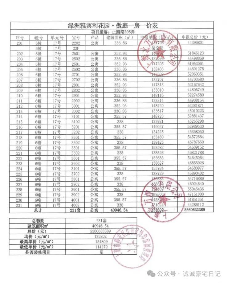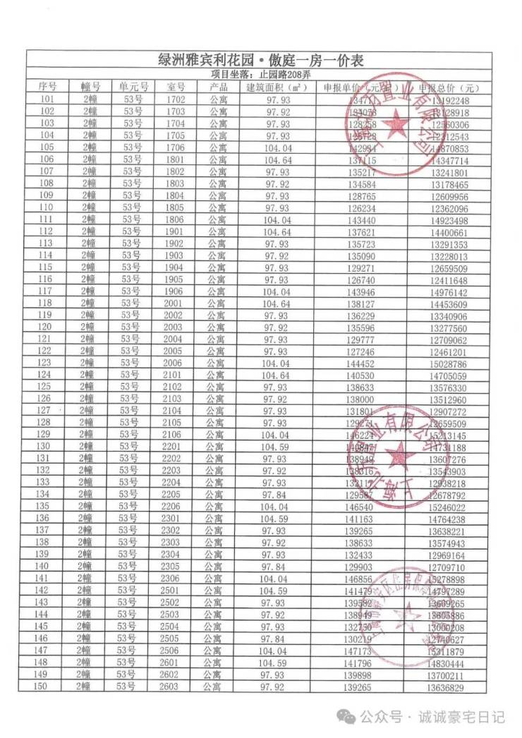 一房一价表发布