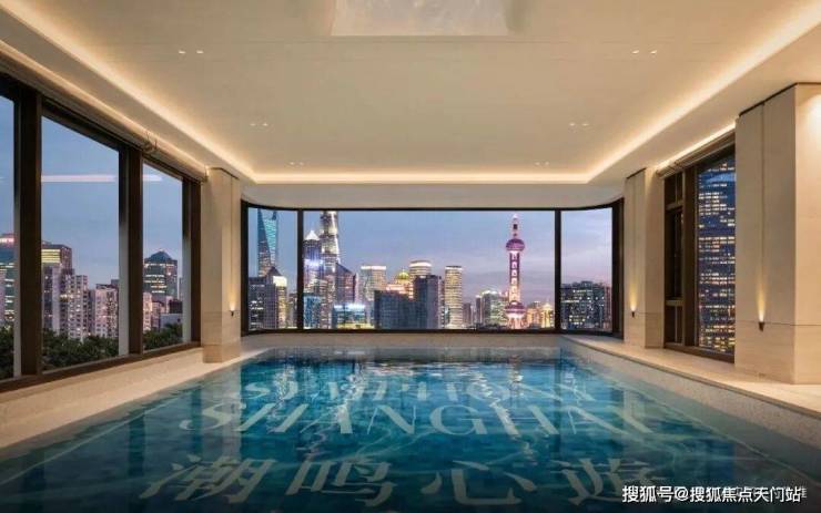 泳池周边以弧形玻璃幕墙围合,外侧可直面陆家嘴“三件套”与中央公园绿意,内侧能俯瞰社区内的万国喷泉与果岭草坪