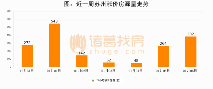 根据诸葛找房数据显示,苏州24小时涨价房源量为382套,较01月05日增加118套,环比上涨44.7%。与此同时,涨价房源占比小幅扩大,业主信心有所提升。