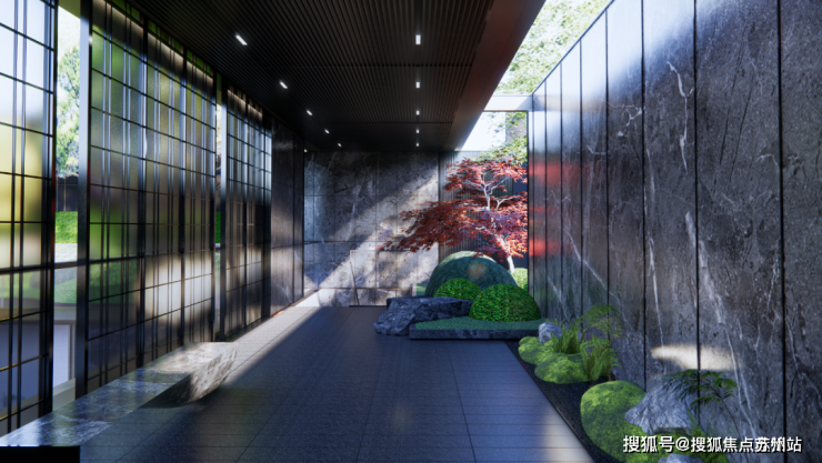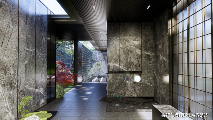 主入口以“自然艺术大观”为核心体验的前区广场,是对城市喧闹拥挤的反叛,预示着一场舒雅而诗意的生活、一种与众不同的身份归属,结合极具现代艺术的门廊,研读与提炼经典美学的精髓,比例、线条、光影与质感,用现代的新材料、新工艺和抑扬顿挫的叙事性空间组织还原秩序,以一种独特的韵律感调和着每一位住户的心弦。整体材料选取灰白石材和仿铜拉丝不锈钢,运用石材拉槽与不锈钢金属线条镶嵌的工艺,精致的线条配以稳重的石材,融合现代美学与古典形制,二者相得益彰。承载从容的空间情感,透漏着自然气息的天然材料和舒适的空间尺度。