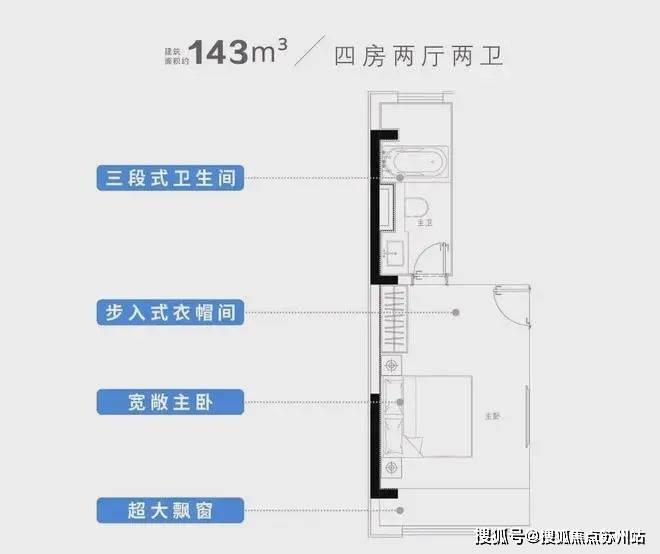 主卧自带全尺寸飘窗+步入式衣帽间,以及独立卫生间,内置大浴缸。