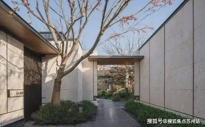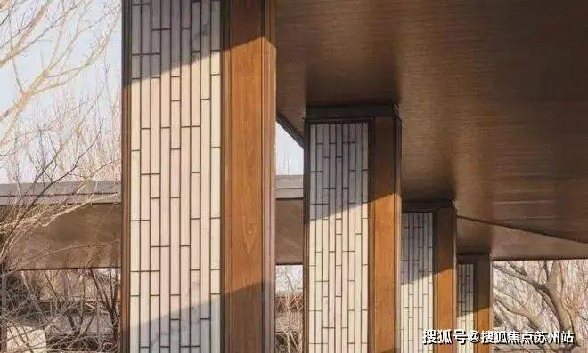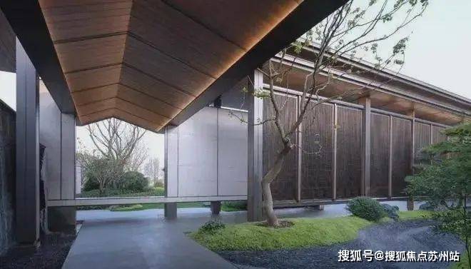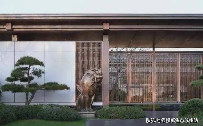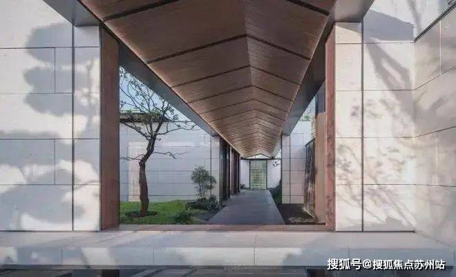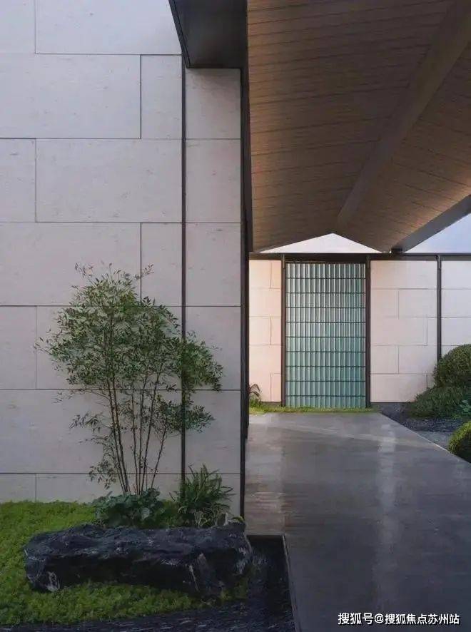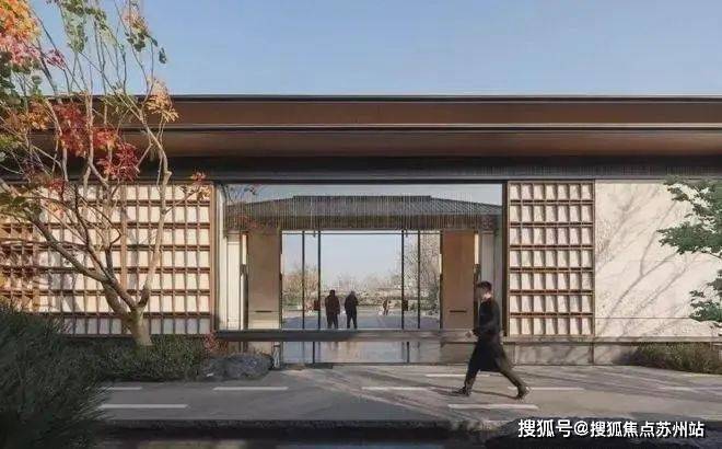 入口整体对称,架空石墙、托举飘板,塑造轻盈悬浮之感。似透非透的半隐格栅,传递苏式生活的隐秘风雅。