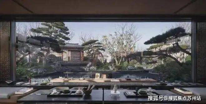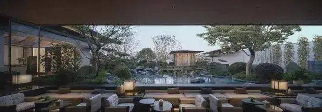 在玻璃盒子内一览园区全景,大面积横向玻璃窗构成巨幅取景框,松石、流水、茶亭,点睛宋画之美。
