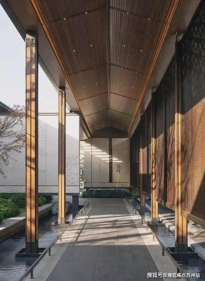 悬浮于水面的深色石径,双坡屋顶打造风雨长廊,木质屏风与白色石墙构成古雅意境,视线对焦点有一棵青松入框,画意盎然。