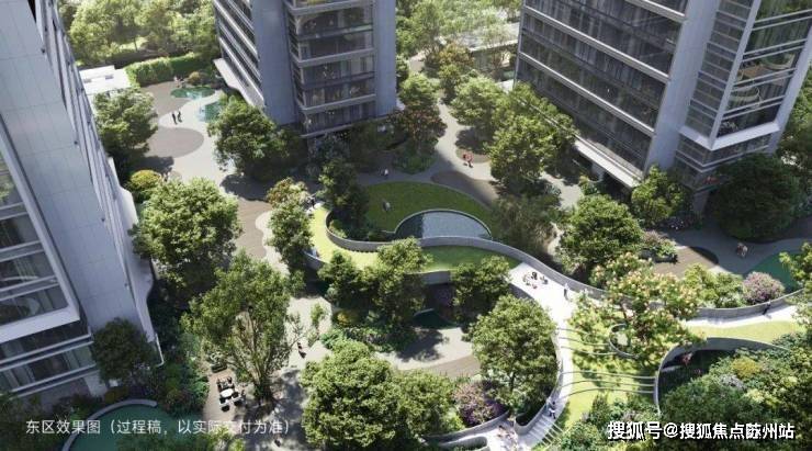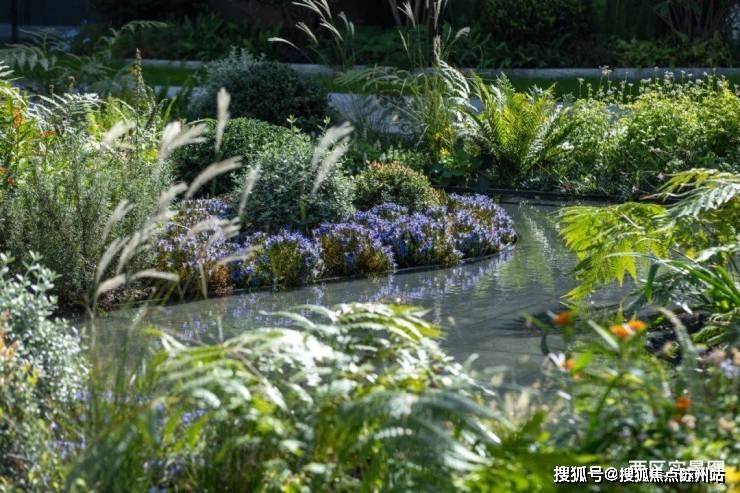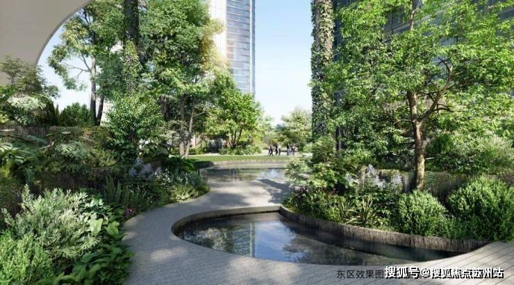 其中东区景观通过线性营造手法打造景观层次,多以柔美松弛的“水曲线”,将不同主题的架空层和户外空间串联起来,建筑与景观之间,形成一个自然丰富、趣味横生的绿意空间,处处体现出恰到好处的生活感。