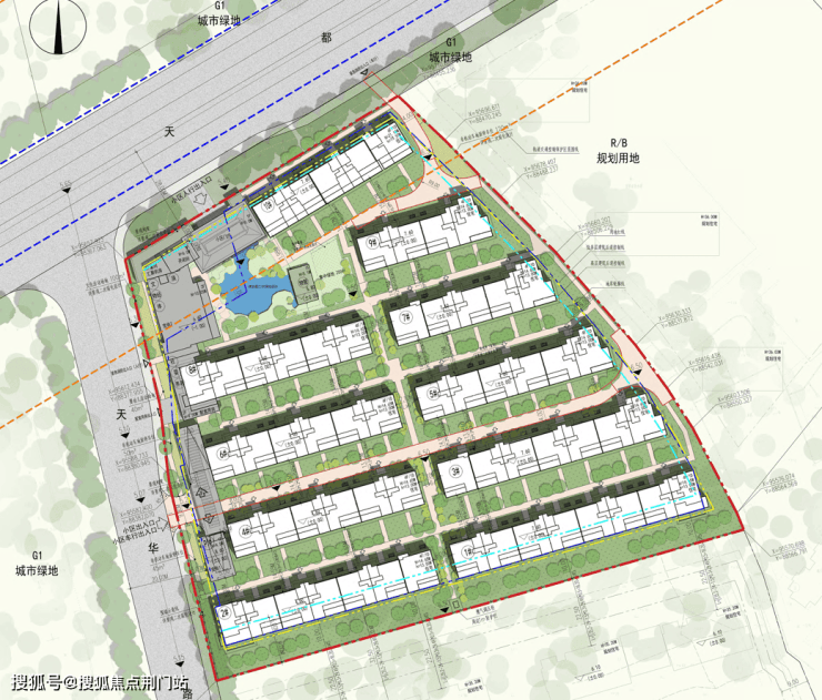 3、建筑外立面材料以干挂石材或玻璃幕墙或金属板材为主,不得采用涂料、真石漆、面砖等材质。注意与周边城市景观界面的通透性,沿天都路一侧的住宅建筑面宽不得大于55米。