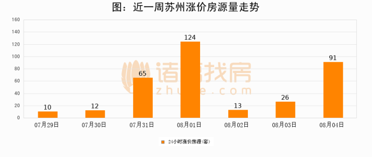 根据诸葛找房数据显示,苏州24小时涨价房源量为91套,较08月03日增加65套,环比上涨250%。与此同时,涨价房源占比小幅扩大,业主信心有所提升。