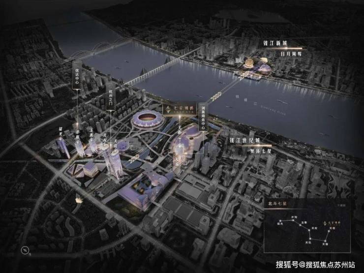 其中勺柄的三颗星,是杭州壹号院的3幢写字楼;勺身 “天权”、“天玑”是杭州之门的双塔,“天枢”、“天璇”是博览中心站上盖。
