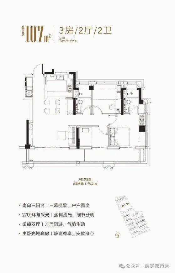 大华星屿建面约107㎡户型 南向2个大阳台的合计建面接近16㎡,远超新规标准。 如果再算上飘窗附赠以及电梯厅延伸空间, 可使用率接近100%! (非得房率,最终房屋得房率以实测报告为准) 同时建面约107㎡户型做到做到了约5米超大宽厅设计, 3.5南向面宽+南北通透的格局让采光通风效果俱佳。 主卧套房配置,朝南次卧面宽约3.2米外接阳台,朝北带大飘窗,做到了真正的大三房功能,每个空间的尺度都远超同面积段区域其他产品,妥妥的明星户型!