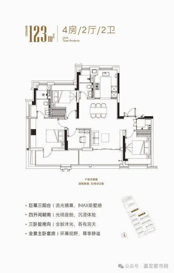 项目建面约123㎡户型则是区域内少有同面积段宽厅 4开间朝南4房 南北通透户型, 附赠建面高达约17.6㎡ ,无论是在使用功能上和尺度上,都远超同面积段其他户型。另外该户型的舒适度把控与收纳细节做得很到位,比如 主卧带独立衣帽间+多飘窗套房设计, 让男女主人有足够的空间摆放私密物品, 入户独立玄关+800库设计 让业主进出的随手物品有了好的位置。