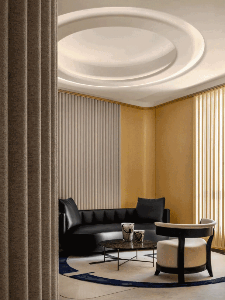 吊顶的优雅曲线与地面线条遥相呼应,营造出从室内到室外的流畅过渡,成就空间的层次美学与视觉延展。