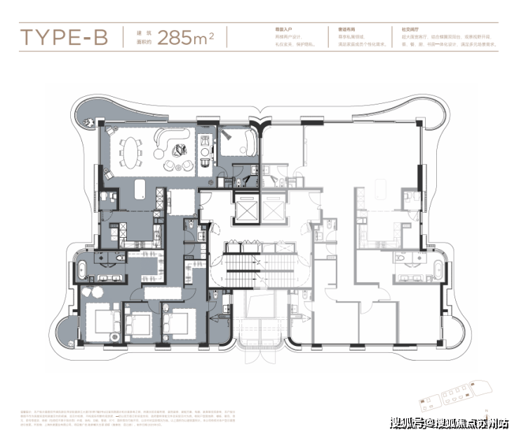3梯2户设计,每户都有独立大电梯厅,双入户洄游动线,另设保姆电梯,顶豪该有的尊崇感被诠释得淋漓尽致。