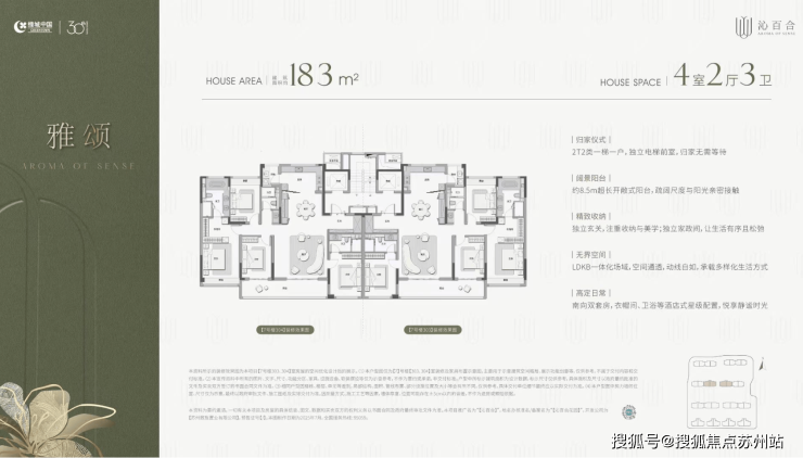 绿城沁百合是由绿城中国开发的纯洋房项目,位于苏州奥体南金堰路西、金鸡湖大道北。这个项目容积率只有约1.8,总户数296户,建筑面积约155-235㎡的纯粹低密洋房,产权70年。绿城中国可是蝉联"中国房地产产品力优秀企业"TOP1的实力开发商,品质有保障。项目展厅在苏州工业园区西华林街88号邻瑞广场一楼山姆会员店出口,有兴趣的朋友可以去实地看看。
