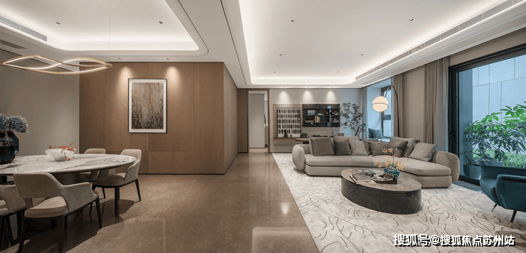 约7.7M超宽客厅及南向瞰景阳台,这个南向采光面的尺度感堪比别墅;另外,客餐厅+厨房一线相连,非常标准南北通透,