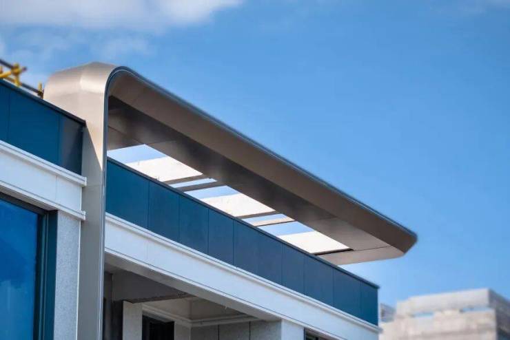 东方大屋檐的建筑形制,加上流线型立面,用铝板、石材、蓝玻,勾勒出当代江南。