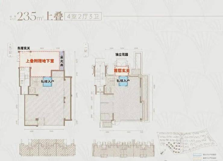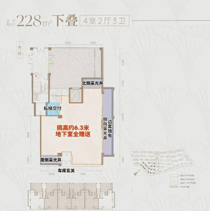 首先,上叠是北向私享入户花园,独门独户,室内私家电梯,尊崇感与私密性都有保障。而且上叠也有地下空间,下单层面积约55㎡,层高达约6.3米,完全做可以做双层使用。
