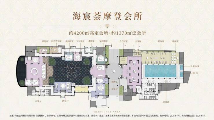 项目规划约4200㎡高定摩登会所与约1370㎡架空层泛会所,远超市面上豪宅会所的尺度,且自持运营,服务品质稳定有保障。