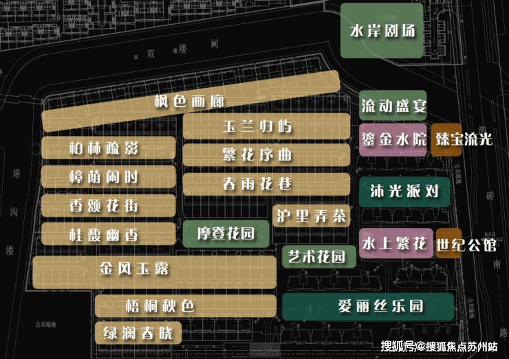 项目以引画入园为理念,将度假丰盈入心的流觞九境,树院、水院、后院,100M+沿河缤纷生活的体验场景。