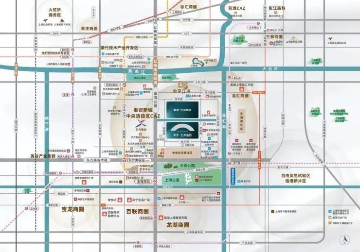 向南,依次坐落万亩中央森林公园、九棵树未来艺术中心、南上海体育中心(规划)、上海之鱼、龙湖奉贤天街......