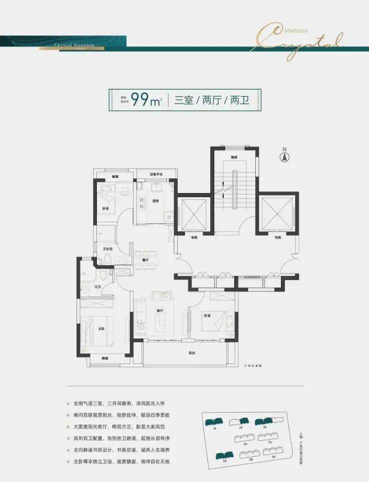 约99平三室两厅两卫为主力户型,三开间朝南,全明设计,南北通透;约6.3米大面宽阳台,视野、光线双丰收!