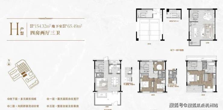 一楼和地下室主社交和志趣,二楼是子女的房间,三楼是主人休憩区.
