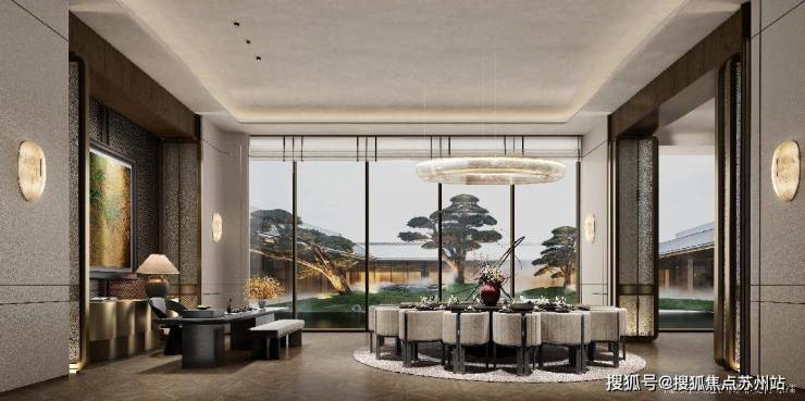 园林景观以"京杭古韵,繁华姑苏"为设计主题,汲取《姑苏繁华图》八景的东方设计美学语言,营造闲适自在的山水园林度假氛围。大区营造1轴3心8大景观,包括1条景观主轴、3纵中心花园和8大景观节点,打造可行、可观、可游、可居的东方诗意天地。
