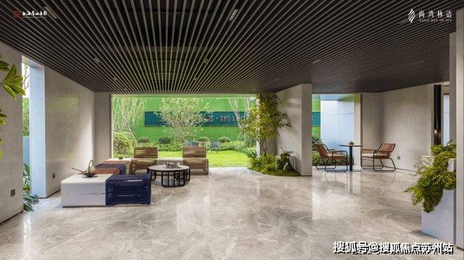 进入内部是灰色大面铝板搭配金色格栅,电梯厅墙面则铺设大面积岩板,吊顶也颇具设计感。