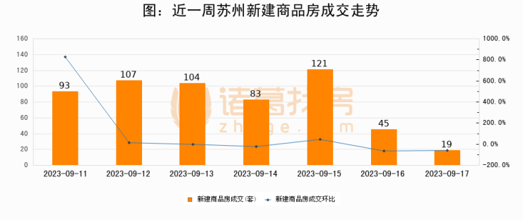 根据苏州市房地产市场和交易管理中心数据显示,2023年09月17日苏州新建商品房成交19套,较昨日减少26套,环比下降57.8%