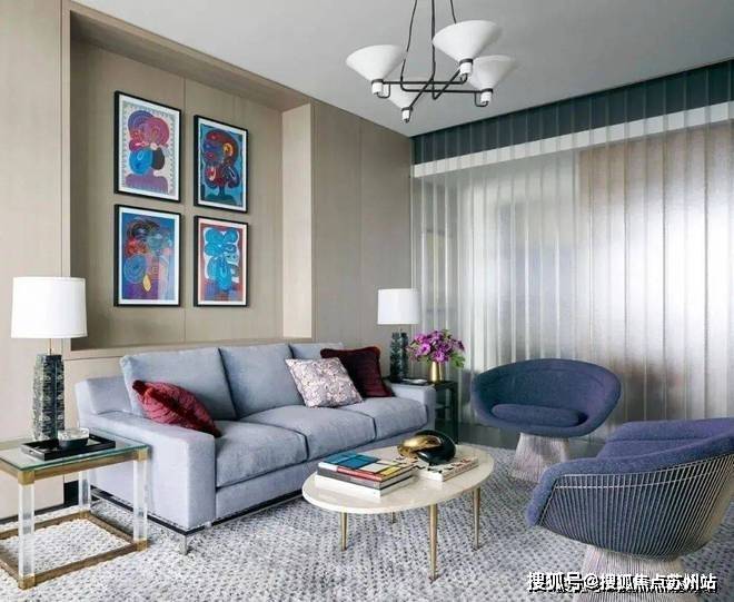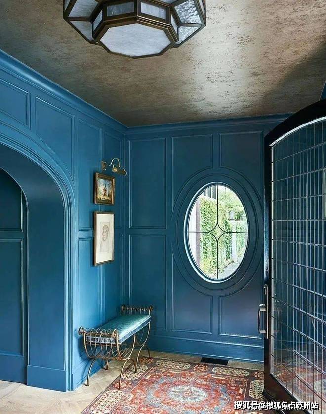 从客厅开始,整个空间都遍布着蓝色的元素,设计师以星座为主题进行设计,搭配上James Thomas的茶几、Holly Hunt的沙发、Minotti的扶手椅和Andrianna Shamaris的边桌,打造既高级又充满梦幻感的居家空间。