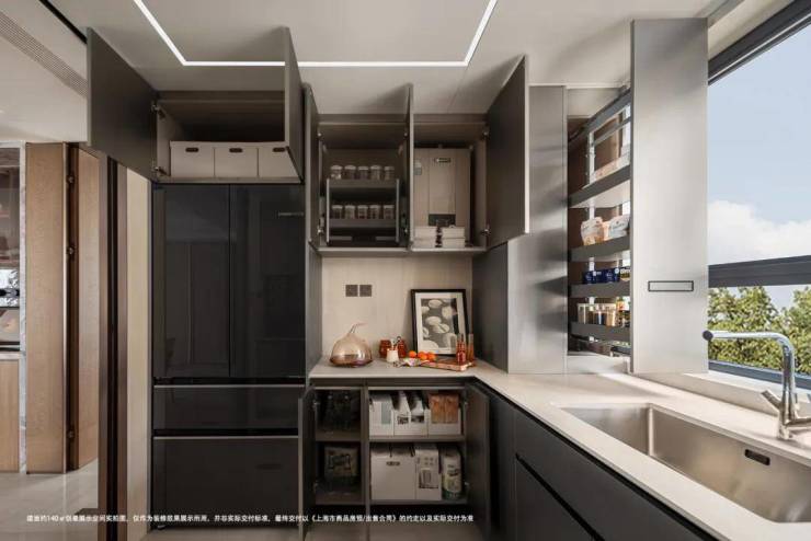 全屋定制柜体,其中就连120㎡户型收纳容积约14600L,行李箱、换季被褥、杂物全藏起来。