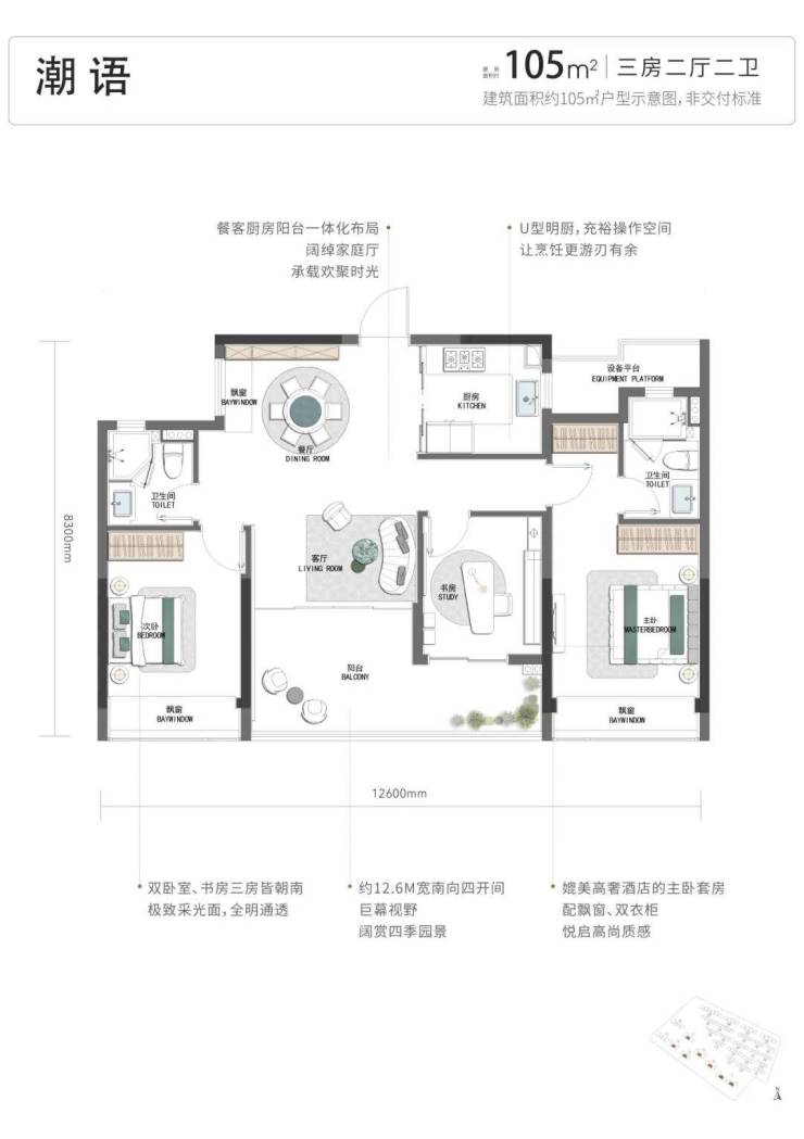 项目的户型起步就是四开间朝南的建面约105方三房: