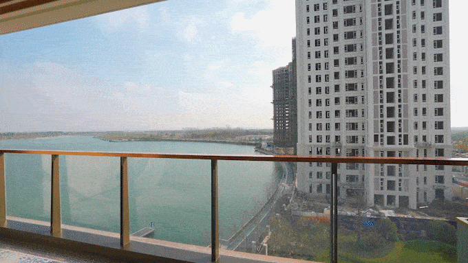 客厅连着2米面宽的超大阳台,一整面墙的视野去看湖。