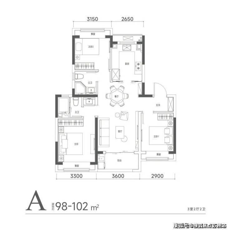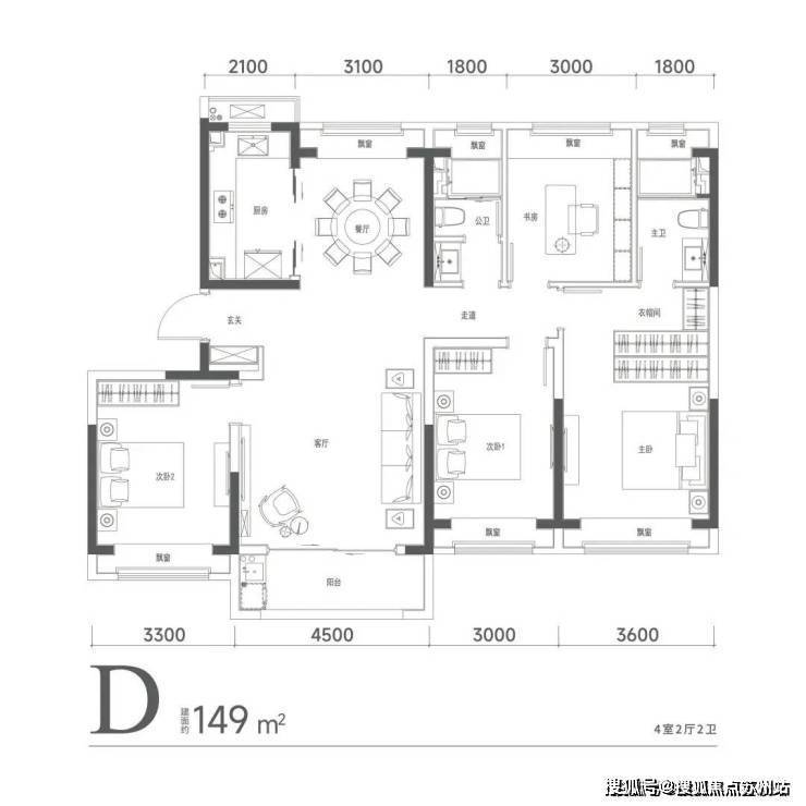 客厅横厅布局,面宽约6.2米;餐厅独立,宽度达3.25米,可放置多人就餐圆桌;南向三卧,双套房设计,主卧面宽约3.7米,带衣帽间、淋浴、浴缸。次房间宽也达3.3米;两个小房间开间也有3米和2.9米,都能放大床。另外,客厅连接约8㎡大阳台(不封阳台,算一半面积),整个社交区域方正、阔绰,待客、休闲皆从容自在。6个飘窗设置(不算面积)更很好延展了室内空间。在入户仪式感上,该户型还享独立电梯厅入户。