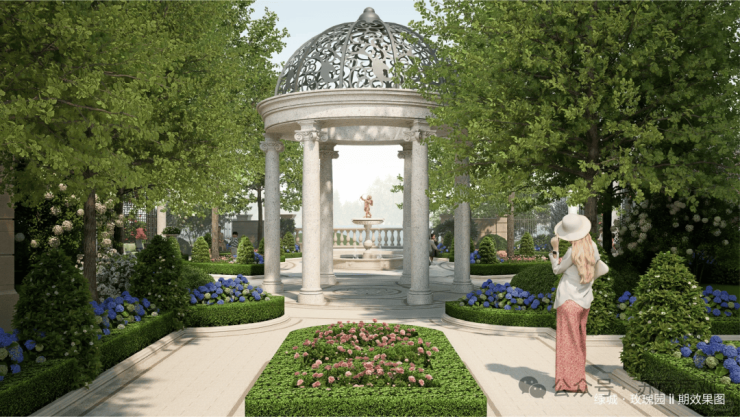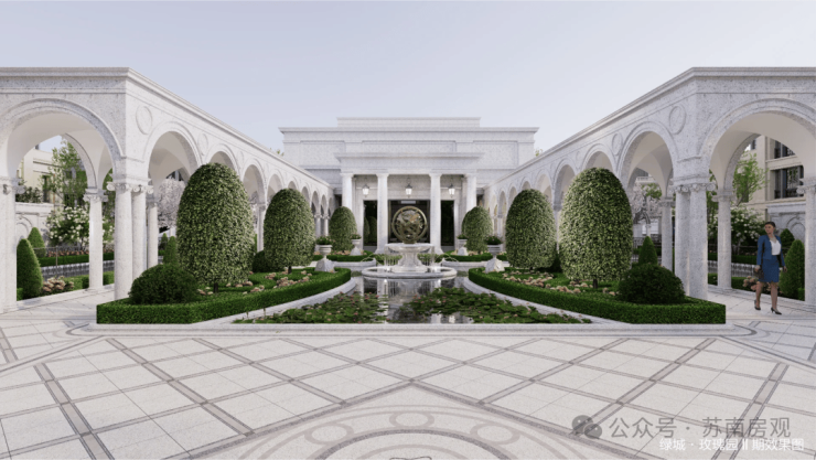 玫瑰园II期与北侧一期一脉相承,承袭绿城一以贯之的法式精工美学。外立面采用整石立柱,营造出沉稳厚重的质感;园区规划中,南大门特别设计了下沉庭院,仪式感与艺术感并存。
