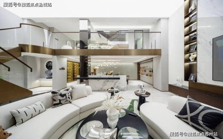 餐厅 厨房与楼梯间,设立了开放的中岛台,形成视觉隔断,在增添功能性的同时,也流露出设计师严谨的美学思考,以及对空间节奏的把控!沿梯下行楼梯利用灯光,呈现出轻盈的悬浮感,夹层作为阅读空间延续了整体色调,在黑白之中求得平衡 不张扬 也不喧闹,弧形沙发和圆形茶几带来的包围感!