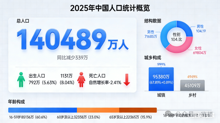 数据显示:2025年末全国人口为14.0489亿人,较2024年末减少339万人,连续第三年人口负增长;全年出生人口仅792万,死亡人口达1131万,自然增长率为-2.41‰。