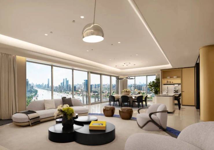 超大面宽客厅结合弧形阳台,搭配着270°大面积宽幅全高玻璃窗,将整个滨江景观尽收眼底!