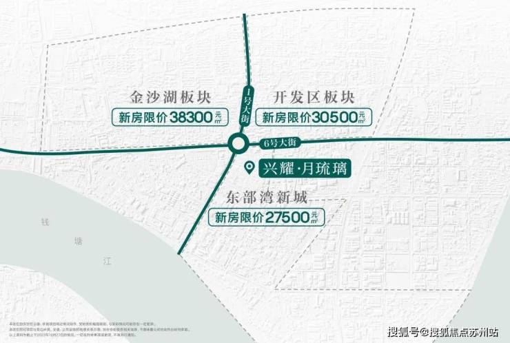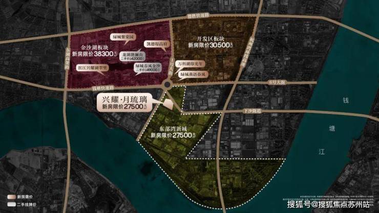 颇为戏剧性的是,因杭州限价体系以道路为坐标,大转盘复杂交错的路网体系,恰好导致它周边数百米内,神奇地形成了3个限价梯度:38300元/㎡的金沙湖、30500元/㎡的开发区,以及27500的元/㎡东部湾新城。