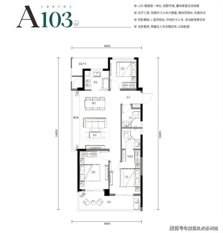 这款建面约103方户型是边套户型,带有约5.9米大边厅,约5.9米大飘窗,南向双阳台,双卧朝南,做出了130方的阔绰即视感。